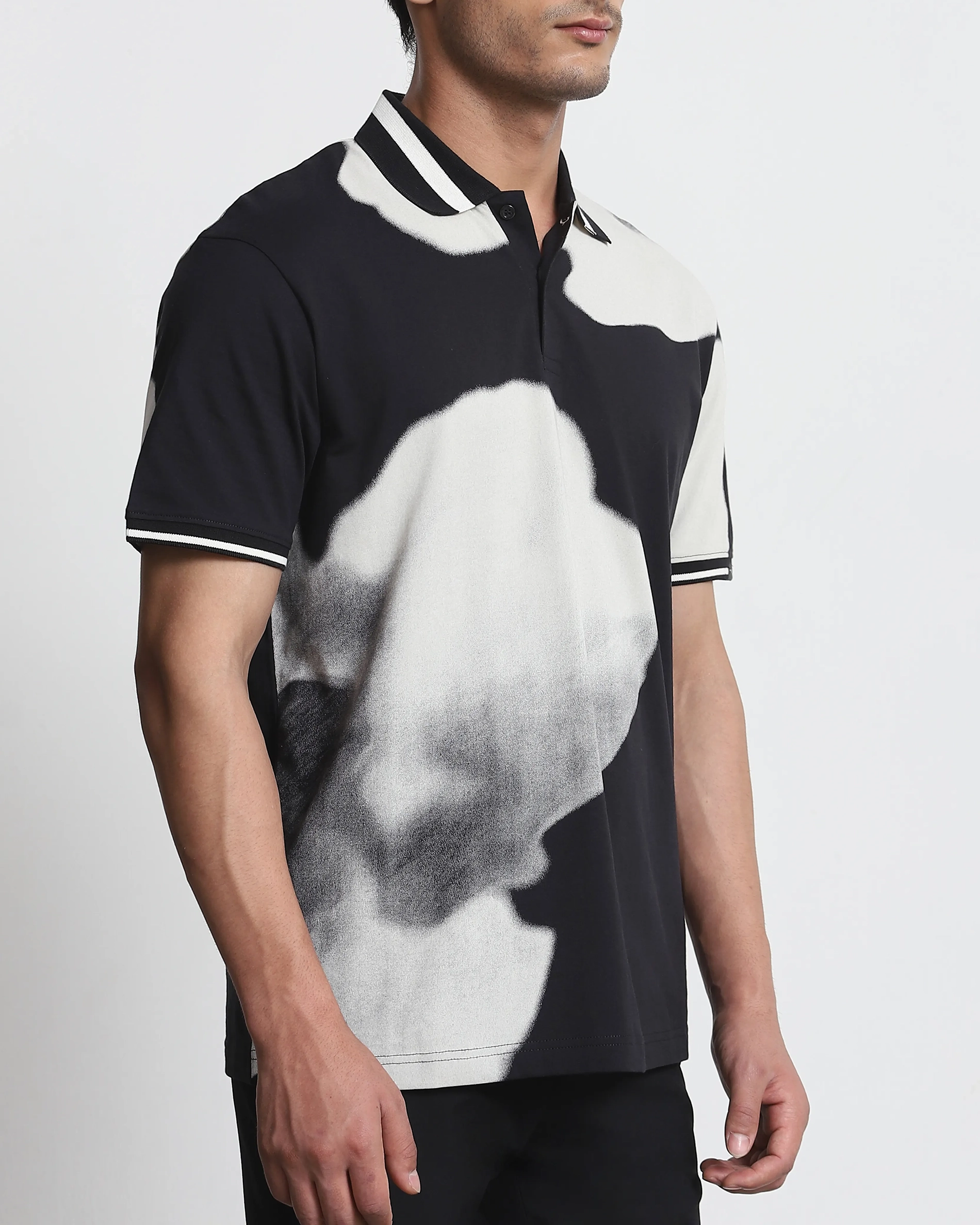 Daily Simple Soft Black Floral Print Polo Shirt 629054